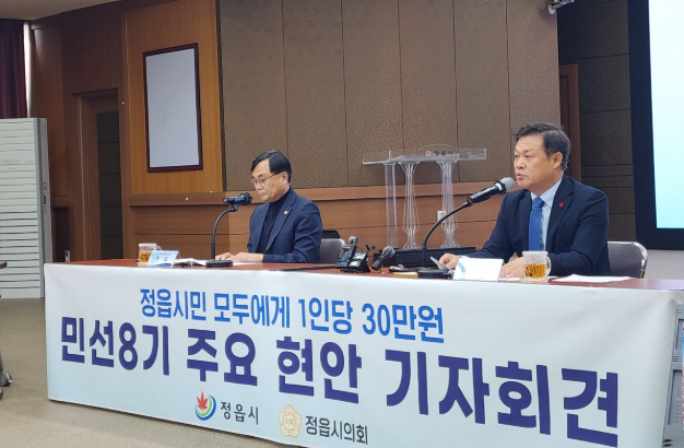 정읍시가 12일 시청 대의회실에서 '민선 8기 주요 현안 기자회견'을 열고 지역 경제 안정화를 위해 민생회복지원금 지급과 2025년도 조직개편 등을 발표했습니다. 이학수 정음시장은 기자회견을 통해 310억 원을 준비해 소득과 연령에 관계없이 시민 모두에게 1인당 30만 원의 '민생회복지원금'을 지급한다고 밝혔습니다.