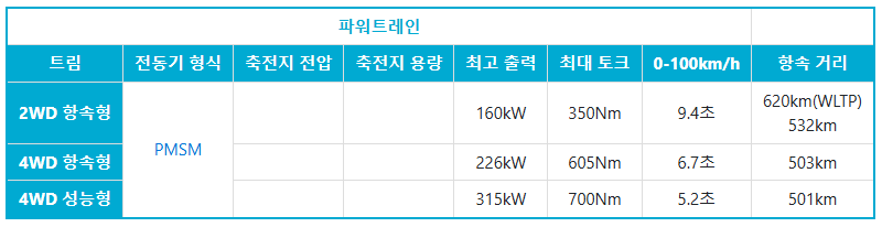 배터리는 우리나라 SK온의 110.3 kWh NCM 배터리를 탑재해 501~532km의 긴 주행거리를 자랑합니다. 400/800V 급속충전을 지원해 350kW 충전기로 10%에서 80%까지 24분 안에 충전할 수 있습니다.