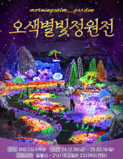 오색별빛정원전은 매년 겨울에 열리는 아침고요수목원의 빛의 축제입니다. 이 축제는 드넓은 아침고요 전체를 화려한 조명들로 장식하여 찾아오는 이들에게 마법 같은 경험을 선사합니다. 연인 가족 친구들과 함께 다양한 빛의 향연을 즐기시면 좋을 것 같습니다. 해시태그 이벤트에도 참여하여 소소한 행복을 맛보며 달콤한 연말을 보내시기 바랍니다.